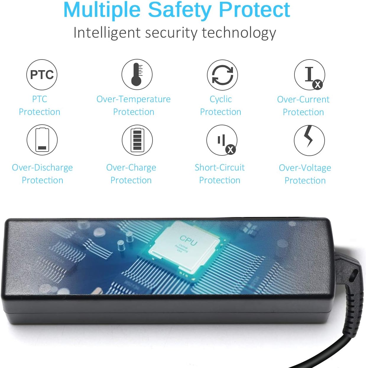 Image 2.1: The charger incorporates multiple safety protections, including PTC, over-temperature, cyclic, over-current, over-discharge, over-charge, short-circuit, and over-voltage protection, designed to safeguard both the charger and your device.