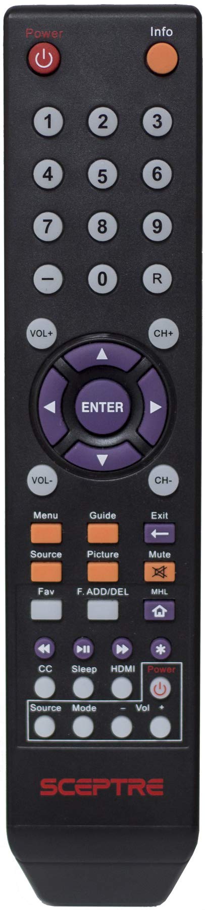 Image: The USARMT 142020479999K remote control, featuring a black body with various control buttons for Sceptre televisions.