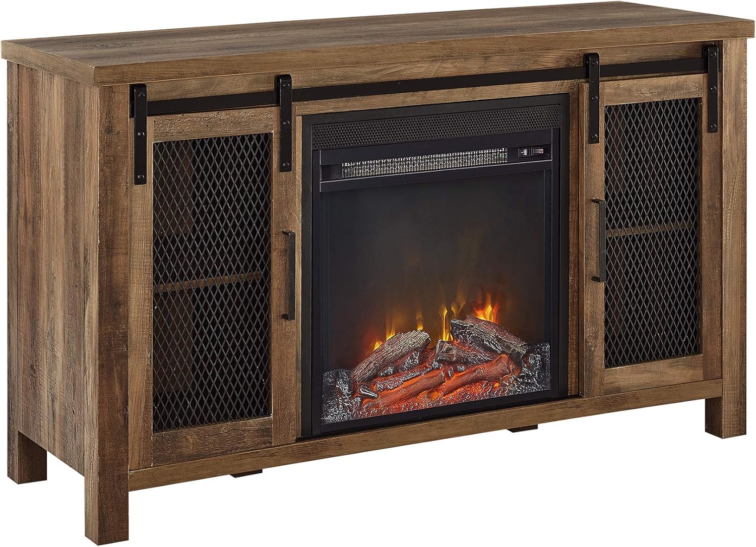Image 1.1: Front view of the assembled Walker Edison W48FPSMDRO Fireplace TV Stand in Rustic Oak finish, featuring a central electric fireplace and two side cabinets with mesh sliding doors.