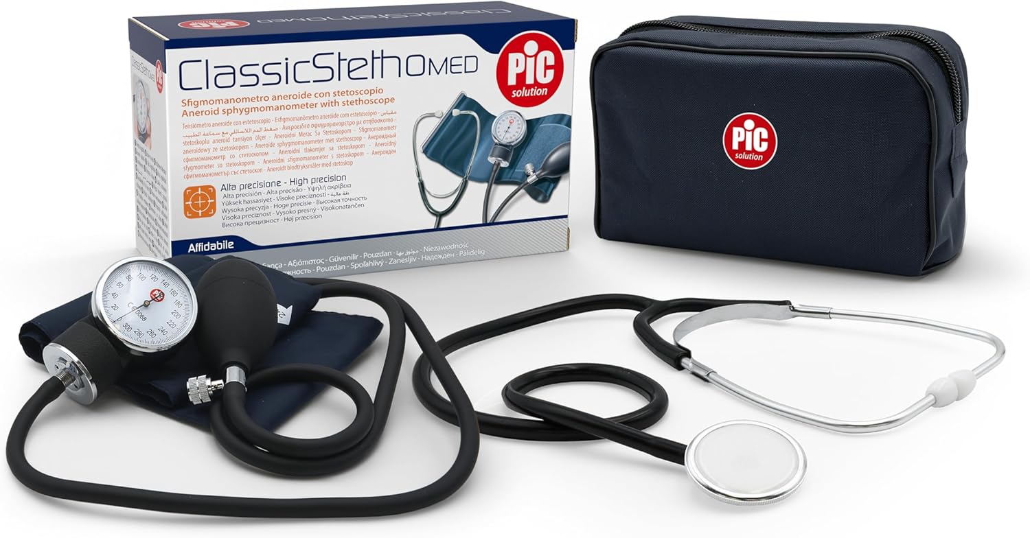 The Pic Solution ClassicStethoMED is a mechanical aneroid blood pressure monitor designed for professional and home use. It includes a clear, highly readable manometer, a comfortable cuff with a pull-ring and Velcro for easy fitting, and a stethoscope for auscultation during arterial blood pressure measurement. A fabric case is provided for convenient transport and organized storage of all components.