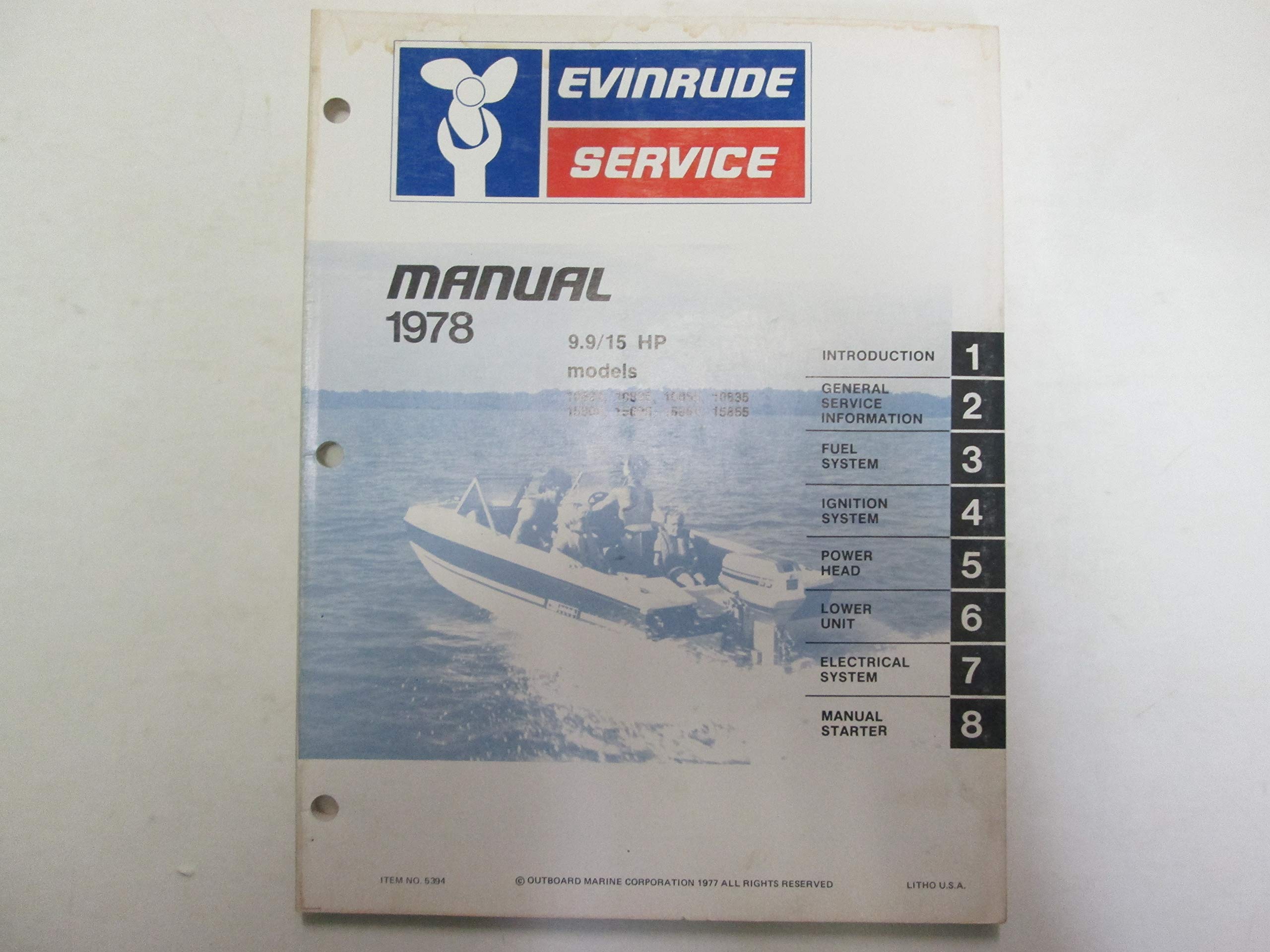 This document serves as a guide to the official 1978 Evinrude Service and Repair Shop Manual, specifically designed for 9.9 horsepower (HP) and 15 HP outboard motor models. This manual (Item No. 5394) is a factory original equipment manufacturer (OEM) publication, providing comprehensive technical information necessary for proper service, maintenance, and repair procedures.