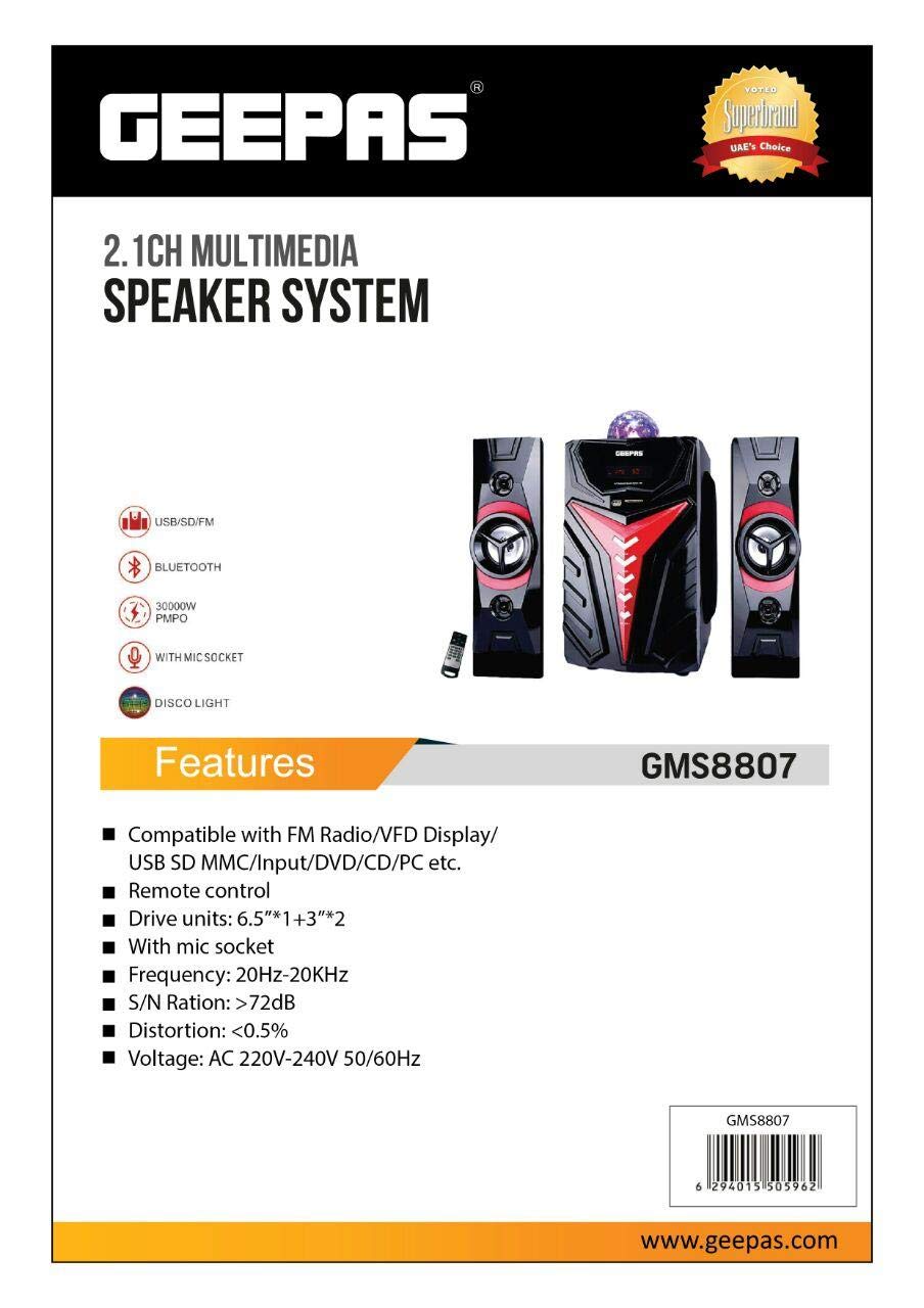 Thank you for purchasing the GEEPAS 2.1 Channel Multimedia Speaker System GMS8807. This manual provides essential information for the safe and efficient operation of your speaker system. Please read it thoroughly before use and retain it for future reference.