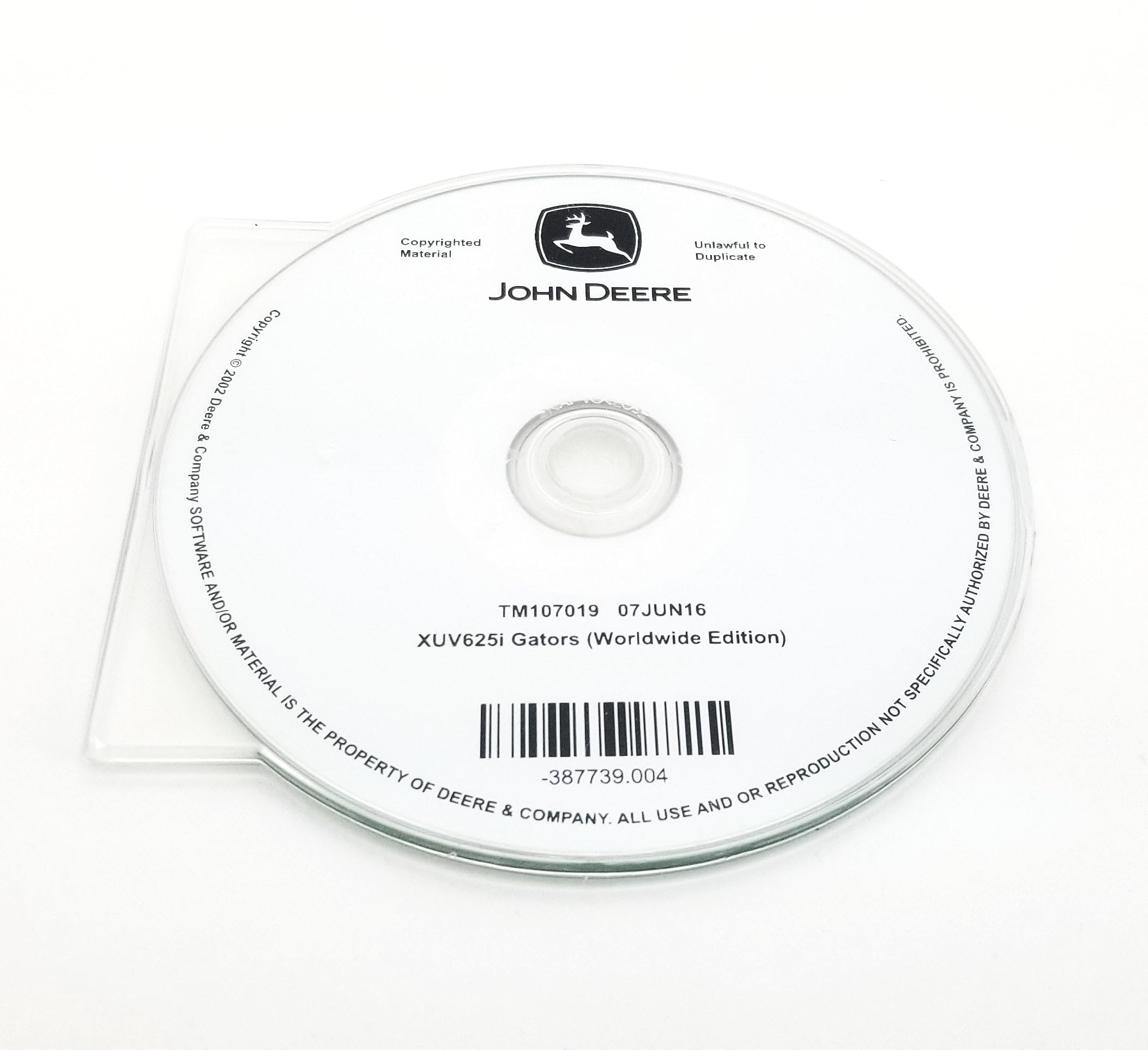 This technical manual CD, TM107019CD, is copyrighted material. The software and/or material contained within this CD is the exclusive property of Deere & Company. All use and reproduction not specifically authorized by Deere & Company is strictly prohibited and unlawful to duplicate.