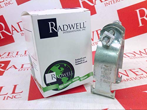 Image: The POWER STRUT PS-1300-2 universal two-piece conduit strap shown alongside its Radwell International Inc. packaging. The strap is made of metal and features a bolt and nut for securing. The packaging indicates it's a new supply from Radwell.