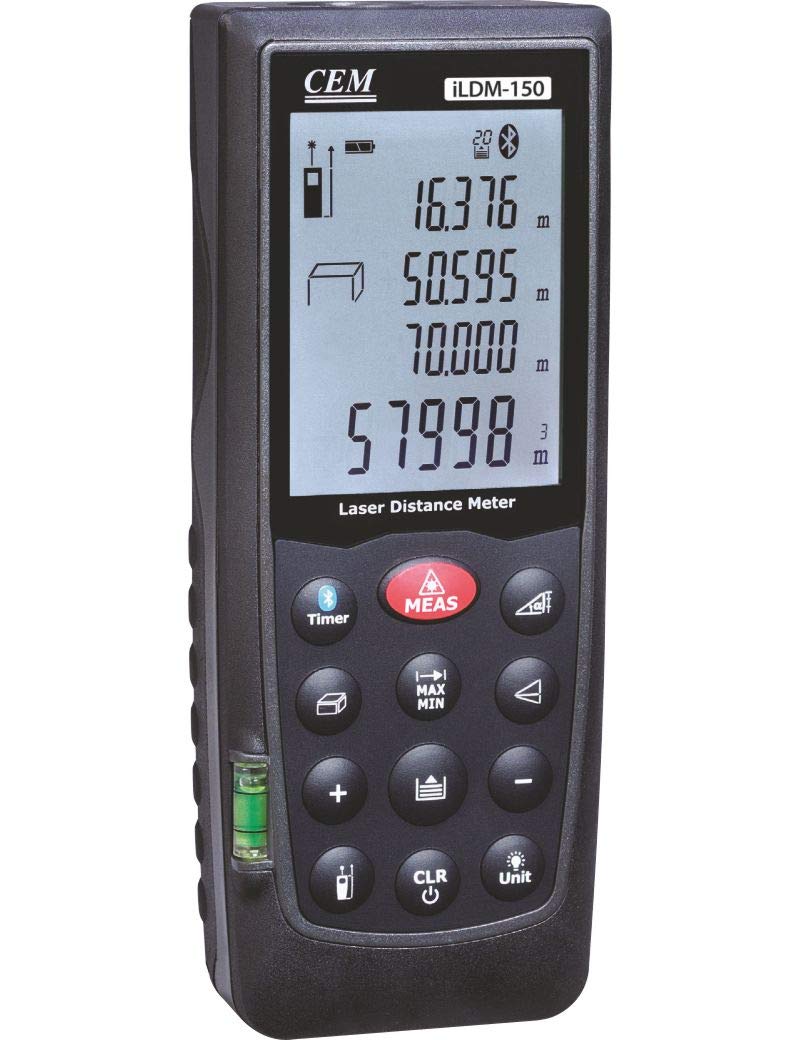 Figure 1: The CEM iLDM-150 Laser Distance Meter, displaying its compact design, digital interface, and control buttons for precise measurements.