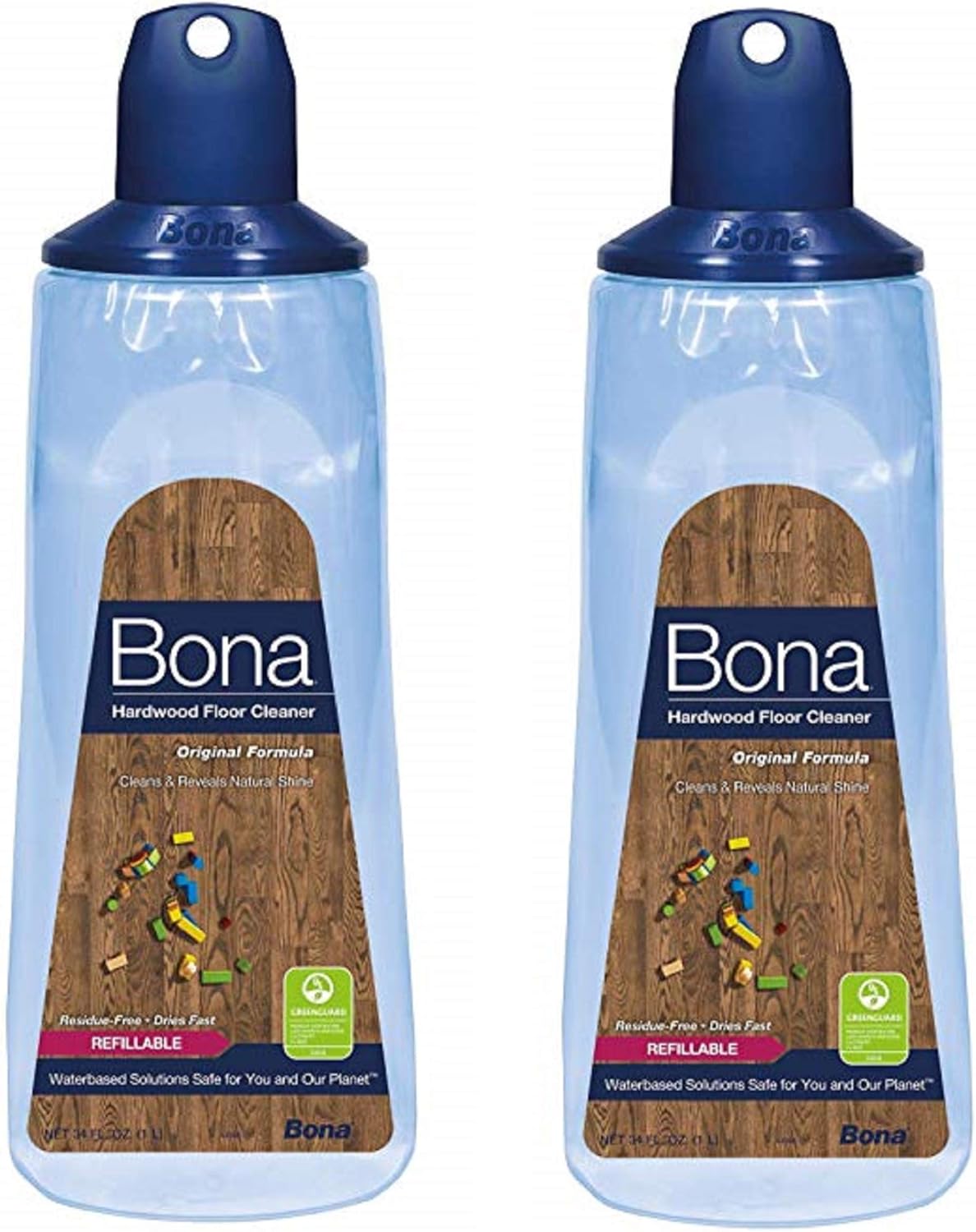 Image: Two 34 oz Bona Hardwood Floor Cleaner Refillable Cartridges, showcasing the product packaging and design.