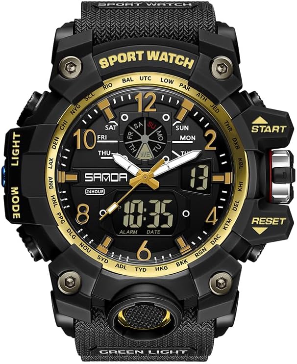 The FANMIS Military Multifunction Digital Watch Model 1222 features a robust design with both analog and digital displays. It includes various functions such as a chronograph stopwatch, countdown timer, daily alarm, date/week display, dual time zones, and LED backlight for clear visibility in low-light conditions.