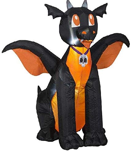 Figure 1: The Home Accents Holiday 4 ft. Pre-Lit Inflatable Winged Black/Orange Dragon Air-Blown, fully inflated. This image shows the black body, orange belly and wing undersides, and a skull medallion around its neck.