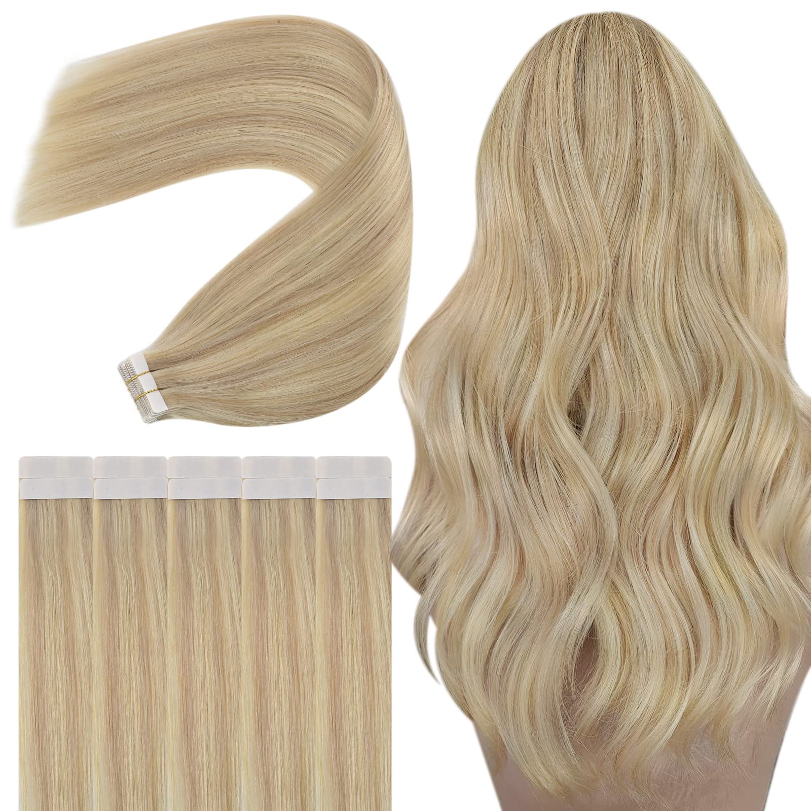 A visual representation of the JoYoung 22-inch Tape-in Human Hair Extensions, showcasing their natural appearance and the bleach blonde with ash blonde highlight color.