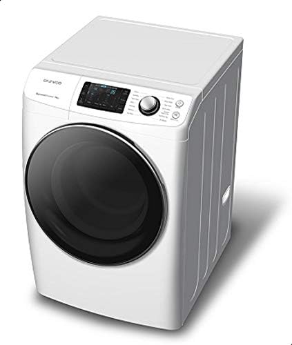 Image: DAEWOO DWC-SD1232 Front Load Washing Machine. This image displays the washing machine from a slight angle, showing its white exterior, the prominent dark circular door for front loading, and the control panel located on the top front with a display and rotary knob.