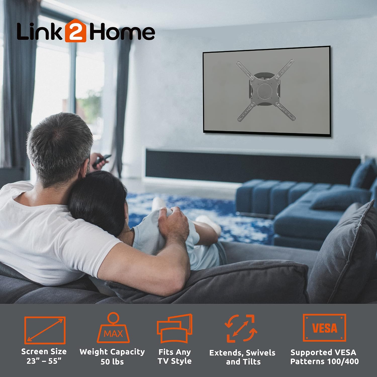 This wall mount is designed for flat and curved TVs ranging from 23 to 55 inches and supporting a maximum weight of 50 lbs. It features full motion capabilities including extension, swivel, and tilt for optimal viewing angles.
