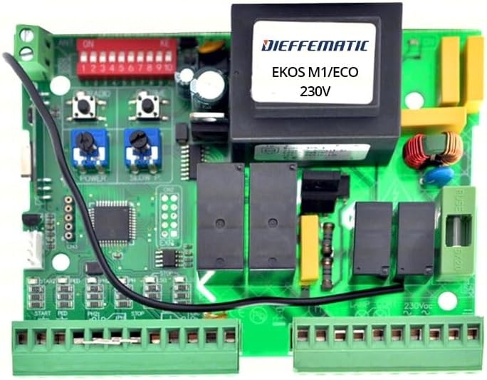 The Dieffematic EKOS M1/ECO 230V control board is a central component for managing sliding gate operations. Below is an image illustrating the main features and connection points of the board.