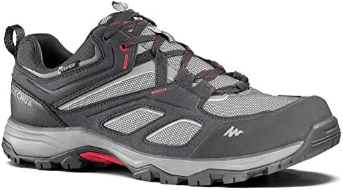 An image of the Quechua MH500 Men's Waterproof Walking Shoes in black. The shoes feature a dark grey and black upper with light grey mesh panels, red accents on the laces and sole, and a rugged outsole designed for grip.