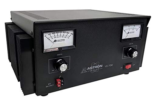 Figure 1: Front view of the Astron VS-70M-AP Power Supply, showing the voltage and amperage meters, voltage adjustment knob, and output terminals.