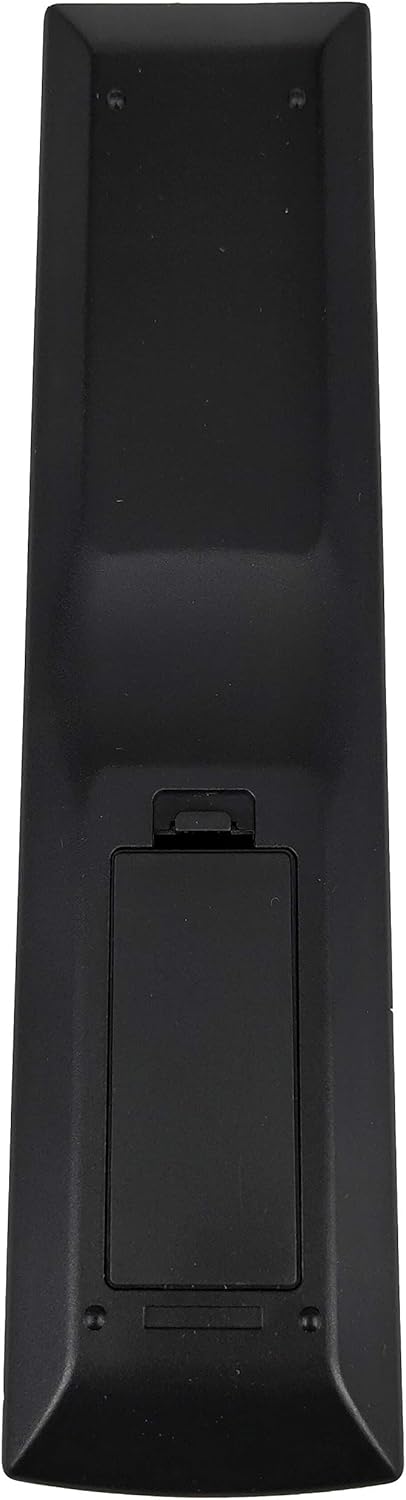 Image: Rear view of the remote control with the battery compartment visible. The compartment cover is located at the bottom half of the remote's back.