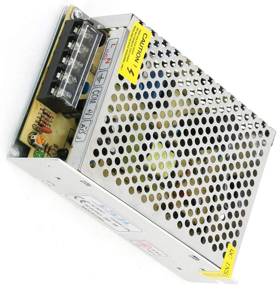 Image: The Aexit S-75-24 switching power supply, showing the input/output terminals and the prominent yellow "CAUTION" label indicating high voltage inside and restricting cover removal to qualified personnel.