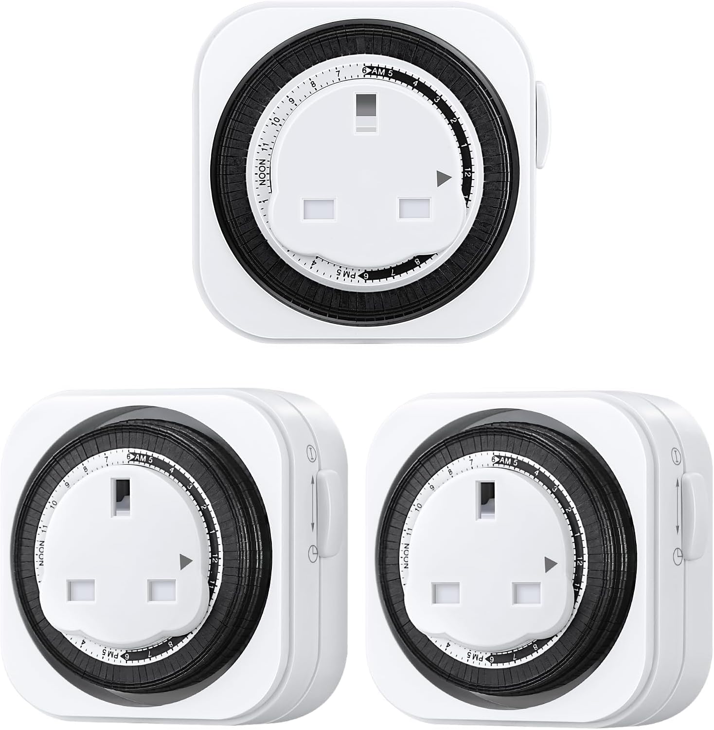 Image: Three DEWENWILS Mechanical Indoor Timer Socket Switches, showing the front and side views of the product.