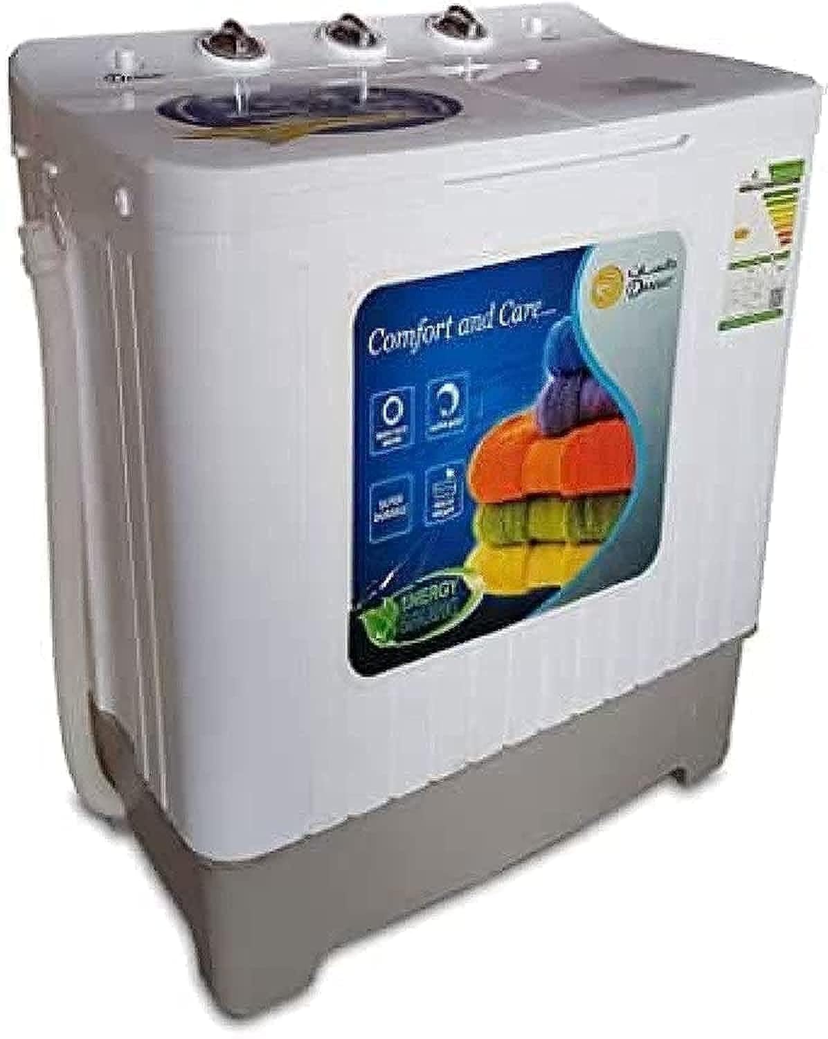 Image: Front view of the Dansat DWT8 Twin Tub Washing Machine, showing the two tubs and control panel.