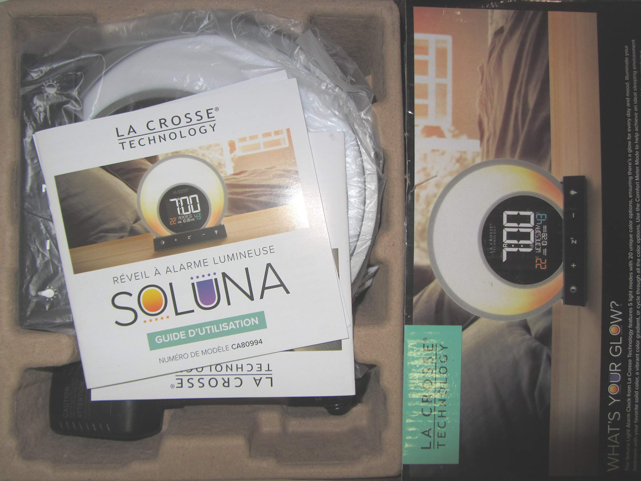 This image displays the La Crosse Technology CA80994 Color Mood Light Alarm Clock and its power adapter, still sealed in their protective plastic within the product's cardboard packaging. The clock features a circular design with control buttons visible at the bottom.
