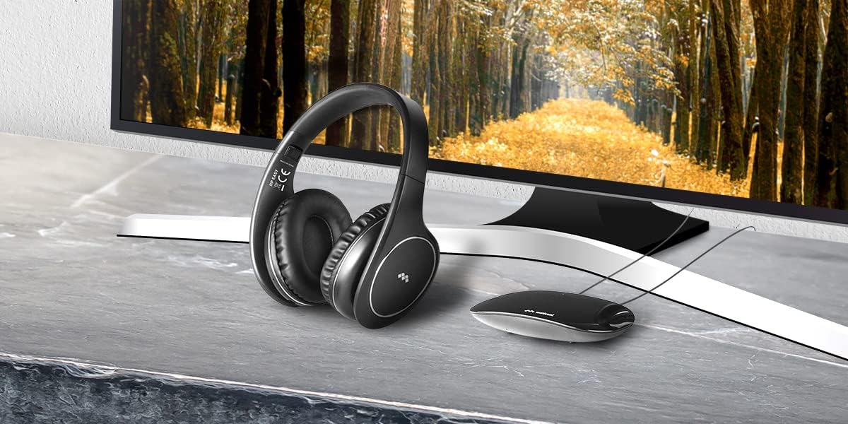 Image: Meliconi HP Easy wireless headphones and transmitter base positioned next to a television, illustrating a typical setup.
