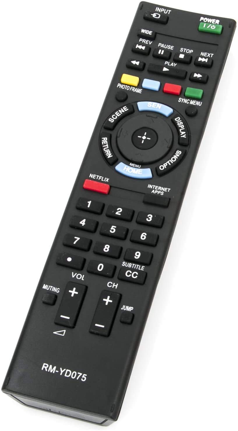 The UBay RM-YD075 remote control is a direct replacement for original Sony TV remotes, offering a familiar layout and functionality. It features dedicated buttons for common functions, including power, input selection, channel and volume control, media playback, and quick access to streaming services like Netflix and Internet Apps.