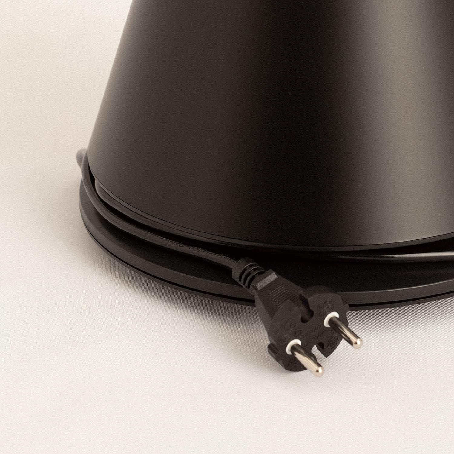 This image shows the integrated power cord and plug, ready for connection to a wall outlet. The cord is neatly wrapped around the base for storage.