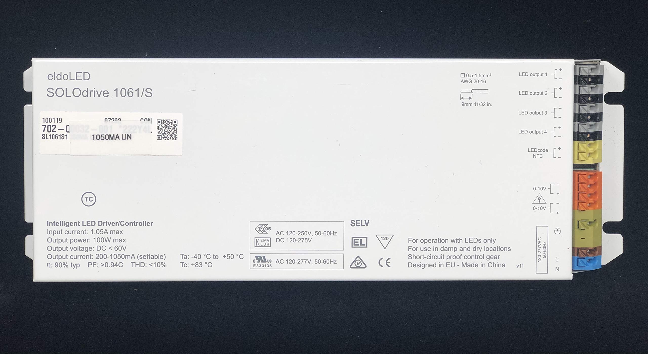 This manual provides essential information for the safe and efficient installation, operation, and maintenance of the eldoLED SOLOdrive 1061/S 1050MA LIN LED driver. This device is a high-performance, 100W, constant current LED driver featuring 0-10V dimming control and four independent 57V outputs, specifically programmed for 1050mA. Please read this manual thoroughly before proceeding with installation or use.