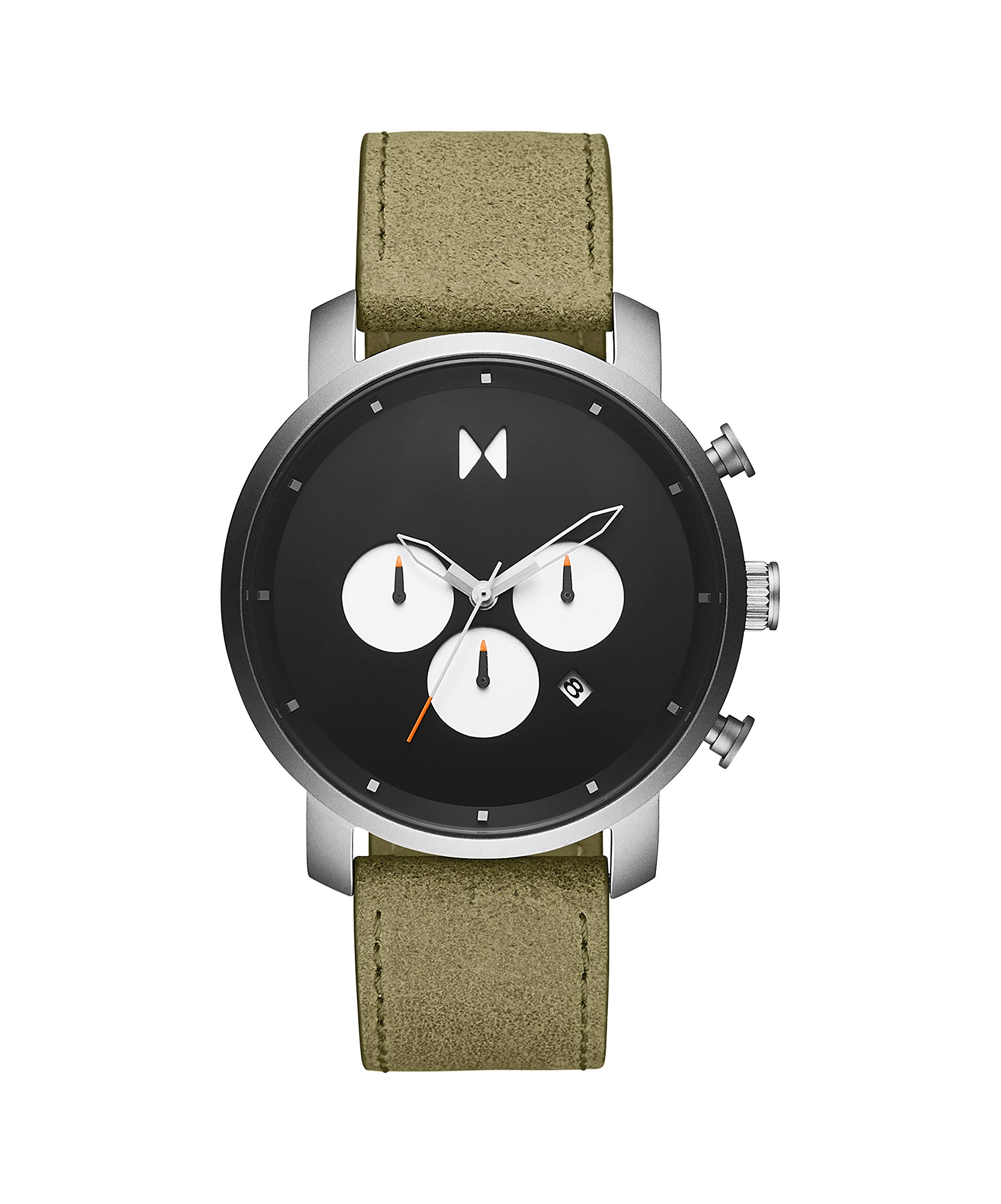 Front view of the MVMT Men's Analog Quartz Watch, Model 28000008-D, featuring a black dial and green leather strap.