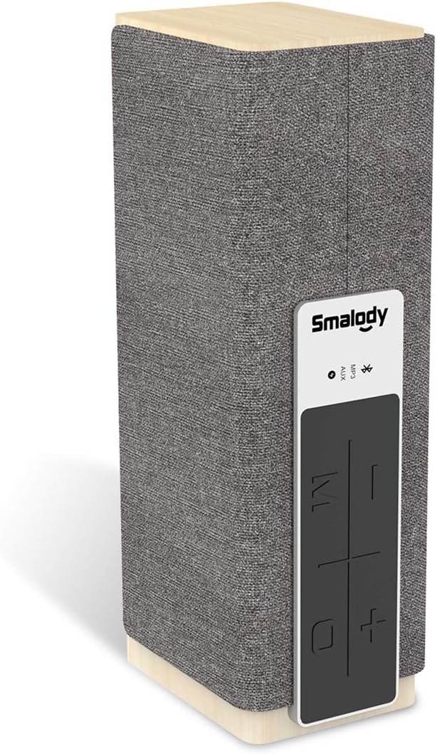 Image: Smalody YXSM8050BT Portable Wireless Bluetooth Speaker, front view with control panel. This image displays the Smalody YXSM8050BT speaker, highlighting its wood and fabric design, and the integrated control panel on the side.
