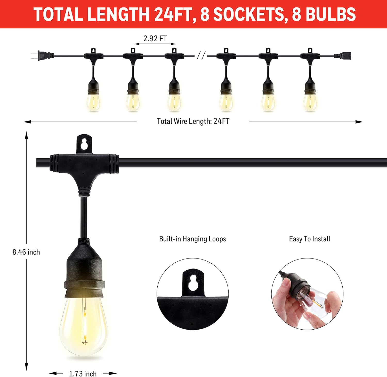 Before installation, plan the layout of your string lights. Consider the length of the strand (24 feet) and the desired coverage area. The lights feature built-in hanging loops above each socket for easy mounting.