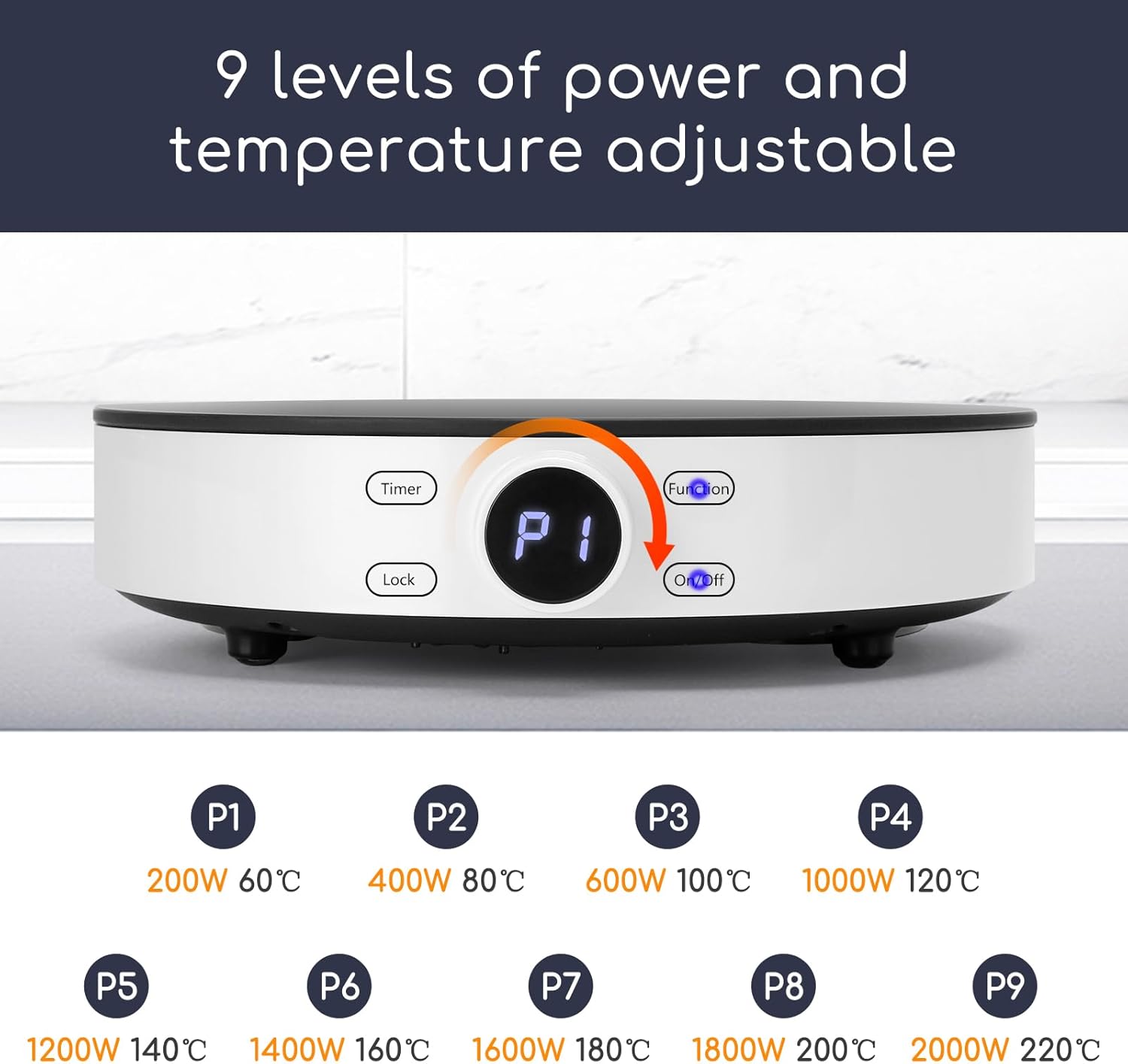 - Power Levels: Rotate the central knob to select from 9 power levels, ranging from 200W to 2000W.