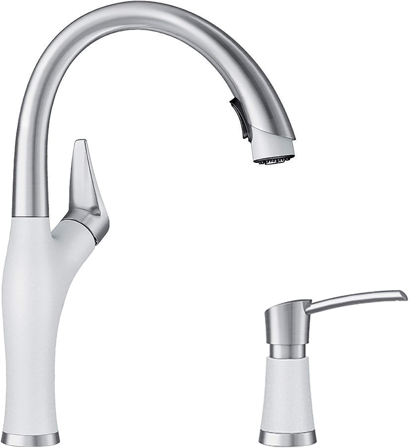 The BLANCO Artona Pull-Down Kitchen Faucet and Soap Dispenser set is designed for modern kitchen environments. This combination offers functionality and aesthetic appeal, featuring a pull-down spray head with dual spray modes and a coordinating soap dispenser. The faucet is constructed from brass with a brushed finish and a white/stainless color scheme, ensuring durability and a contemporary look.
