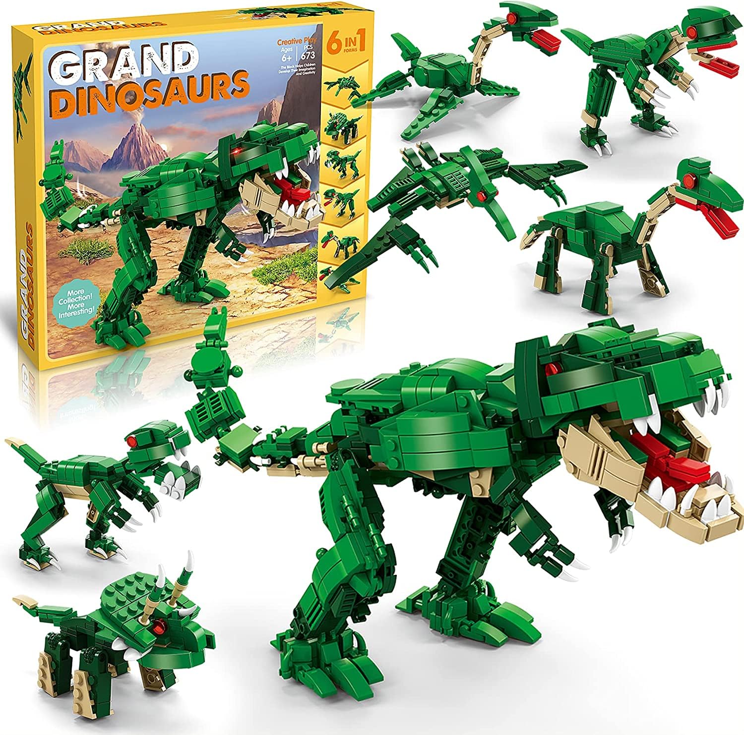 The JOYIN STEM 6-in-1 Dinosaur Building Block Set provides an engaging and educational experience for children. This set includes 673 pieces, allowing for the construction of six individual dinosaur models. These six individual models can then be combined to form one large T-Rex model.