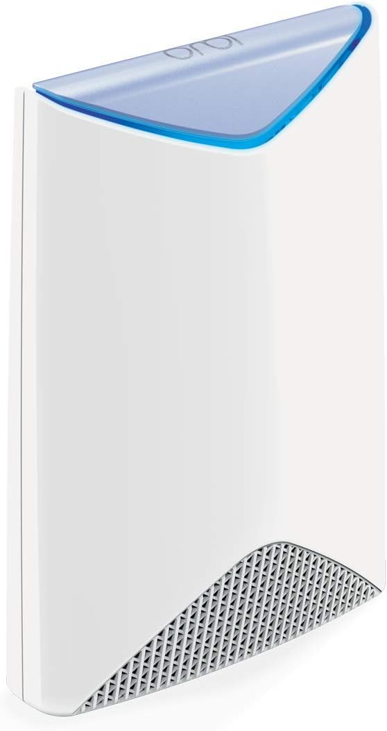 Image: The NETGEAR Orbi Pro SRR60 Router, a white rectangular device with a blue top accent, designed for optimal signal distribution.
