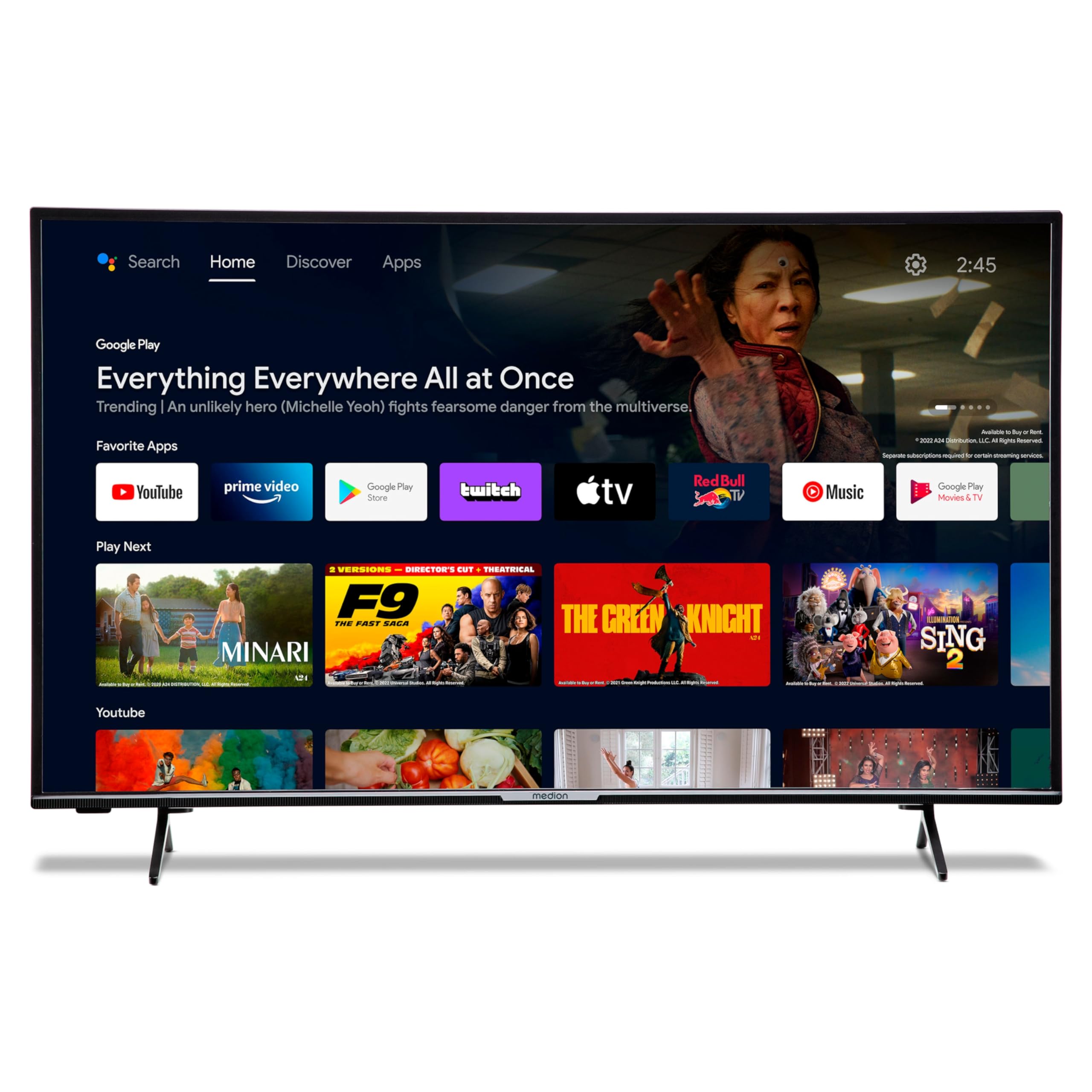 Image: The MEDION P14371 TV displaying the Google Play interface with various apps and games, highlighting its Smart TV capabilities.
