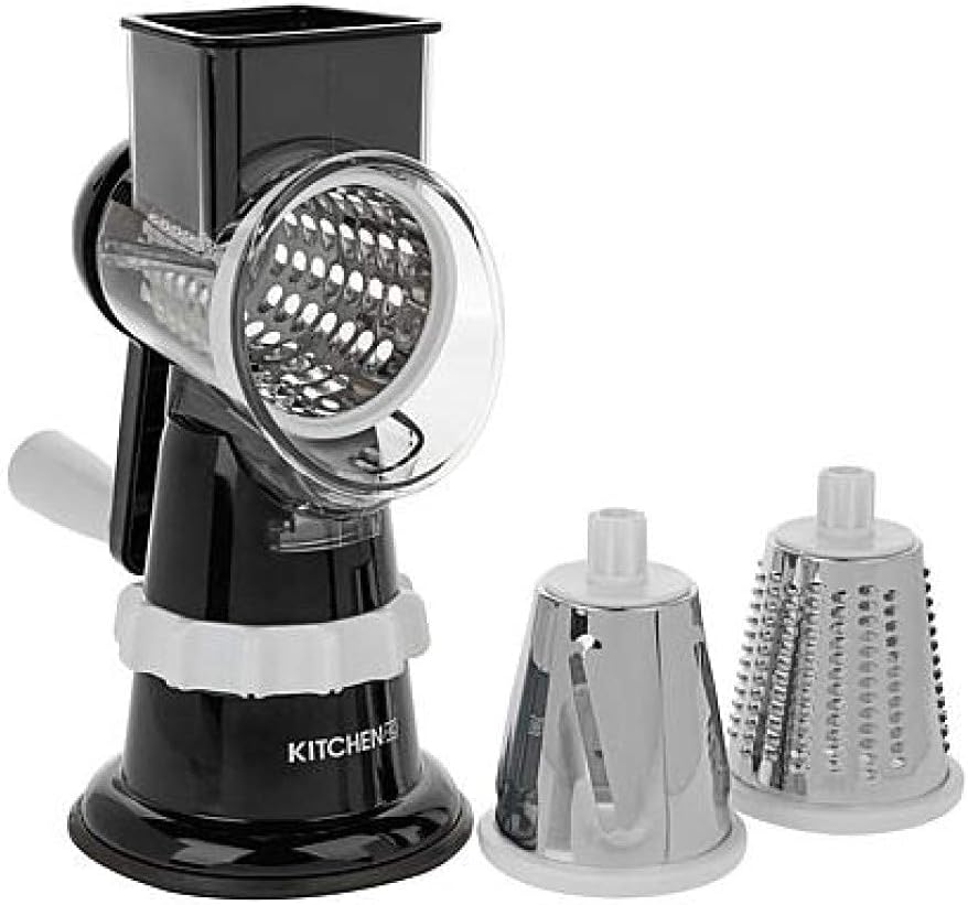 Image: The Kitchen HQ Speed Grater and Slicer, fully assembled in black and white, with two interchangeable blade drums shown separately. This image illustrates the main components of the product.