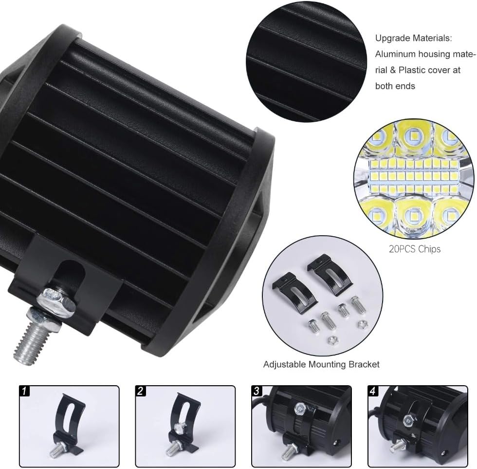 - High-Intensity Visibility: Each 60W work light features 3 rows of advanced LED chips, producing a bright 3600LM 6000K white light. The 120-degree ultra-wide projection reflector optics ensure uniform light distribution, enhancing visibility during night driving, low light conditions, or rain.