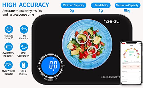 Image Description: This image displays the Hesley Smart Kitchen Scale with callouts for its high accuracy features. It shows a minimum capacity of 5g, readability of 1g, and a maximum capacity of 8kg. Other features highlighted include 60s auto shut-off, tare function, low battery indicator, unit conversion, and overload indicator. The scale is shown with a plate of salad on it, and a smartphone displaying the AiFresh app interface.