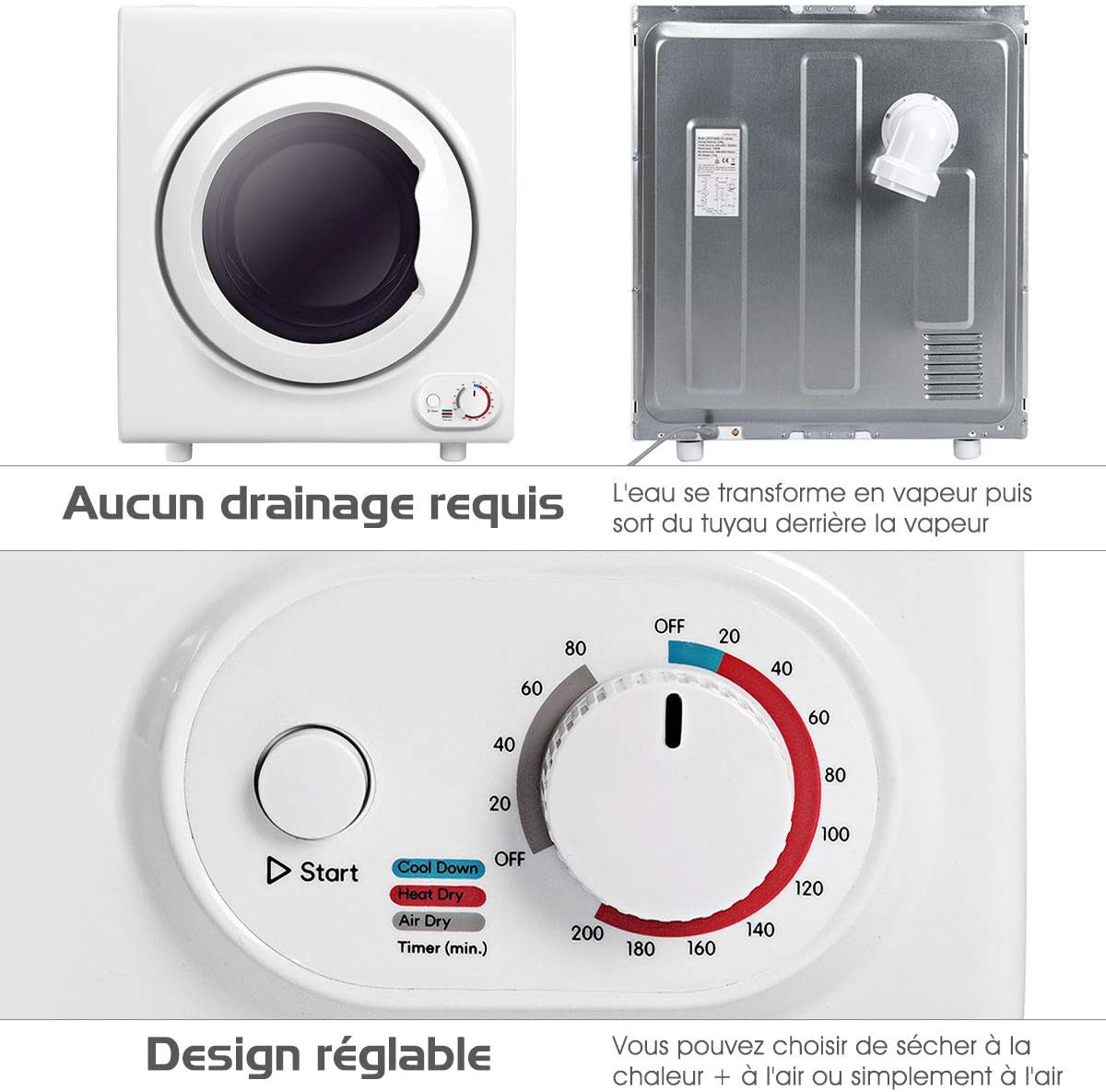 The GOPLUS FQ34865EFFR is a compact 4KG/75L capacity condensation dryer designed for efficient and quiet operation (less than 50dB). It features multiple drying modes including Heat Dry, Air Dry, and Cool Down, controlled by a simple timer dial.