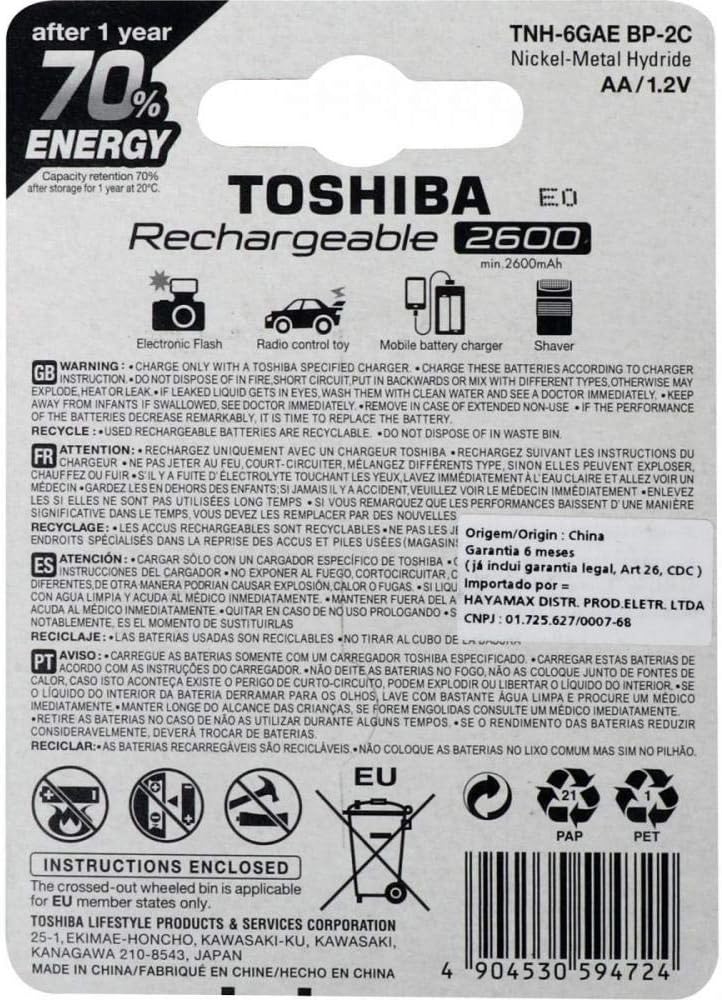 Image: Front view of the Toshiba AA rechargeable battery packaging, displaying two batteries with '2600mAh' capacity and 'Ready to use at any time' indication.