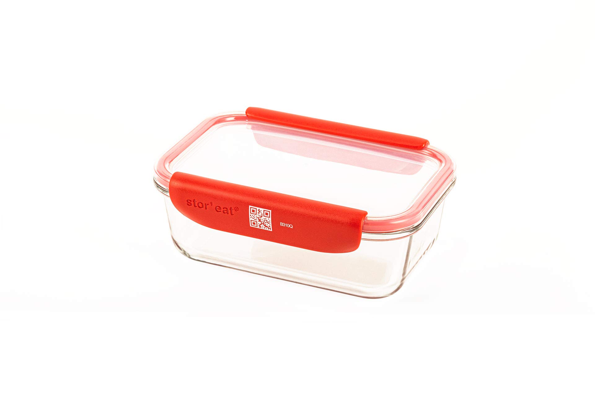 Image 1.1: The Mastrad Stor'Eat Connected Food Storage Container M, featuring a clear glass base, red lid, and removable red handles.