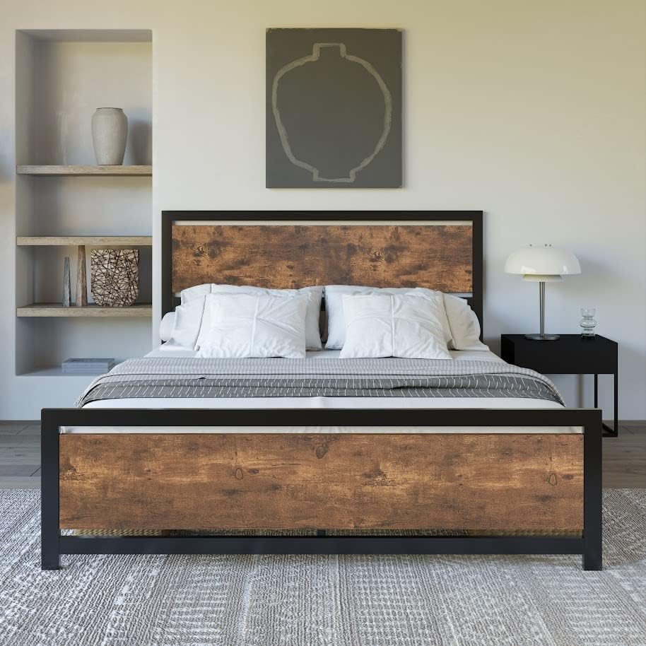 The AMERLIFE Full Size Bed Frame features a sturdy metal platform design with an industrial-style wood headboard and footboard. It is engineered for durability and stability, providing a reliable foundation for your mattress without the need for a box spring. The frame includes four U-shaped support frames for enhanced stability and offers ample under-bed storage space.