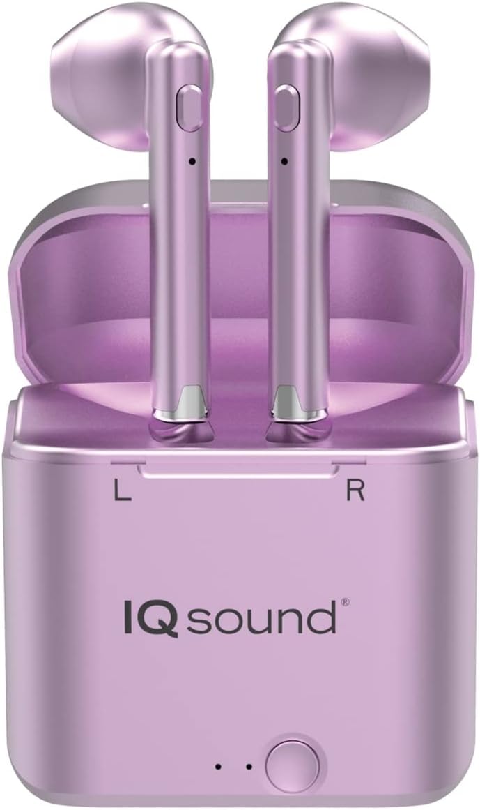 Image: Supersonic IQ-235TWS-RSG True Wireless Bluetooth Earbuds shown inside their charging case. The earbuds are purple with silver accents, and the charging case is also purple, featuring "IQ sound" branding and an indicator light/button at the bottom.