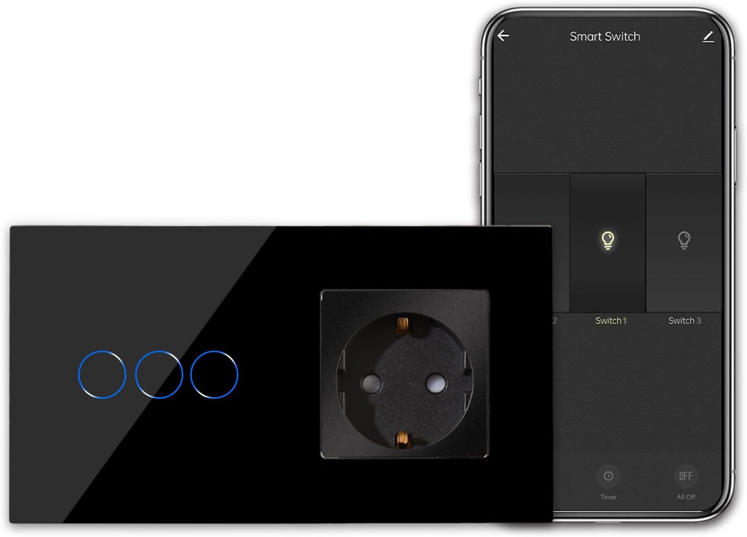 The CNBINGO Smart Touch Switch features a sleek glass panel with three touch-sensitive light switches and one integrated Schuko socket. It offers a modern aesthetic and advanced control options for your home.