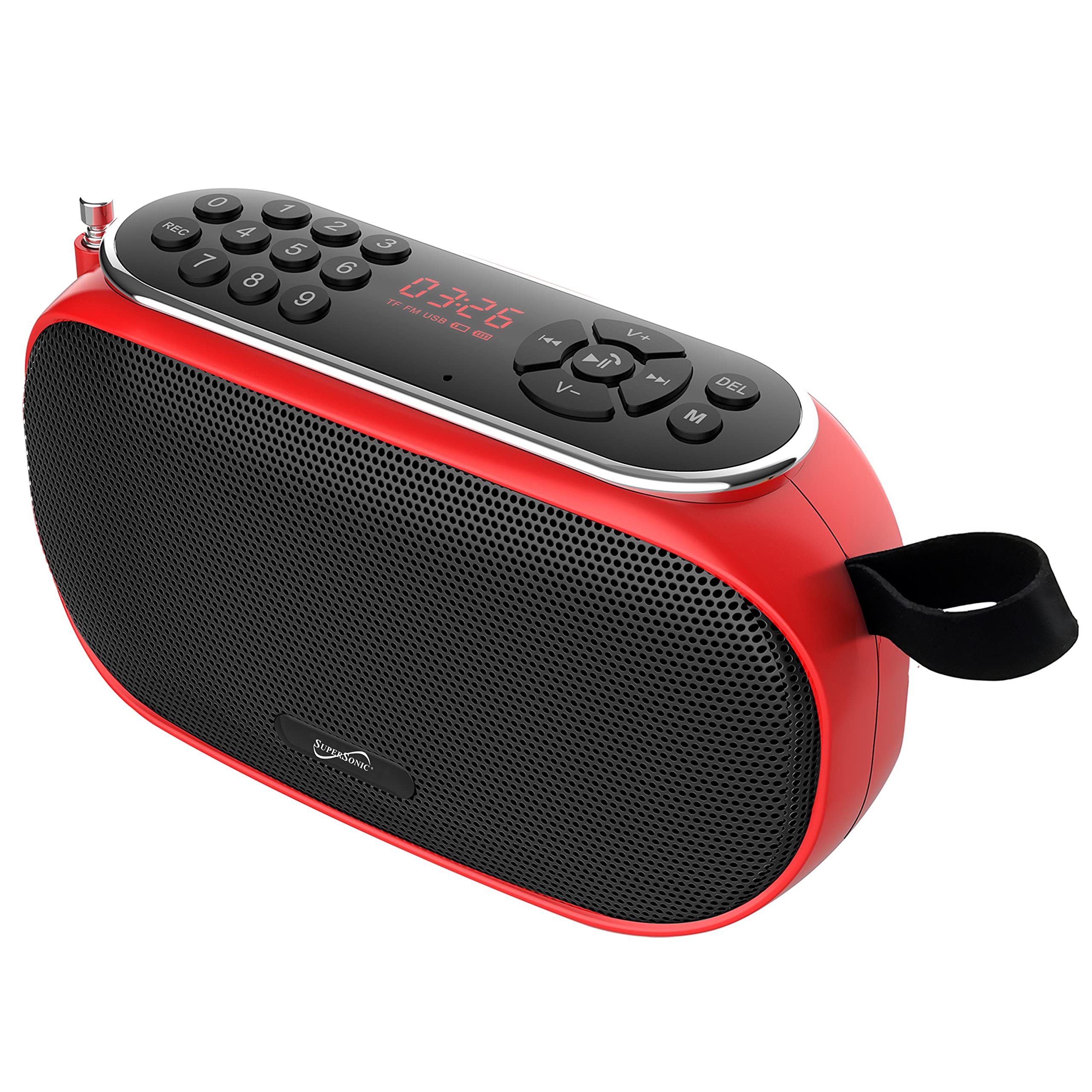 Image showing the front and top view of the Supersonic SC-1444BT Portable Bluetooth Speaker in red, highlighting the LED display and speaker grille.