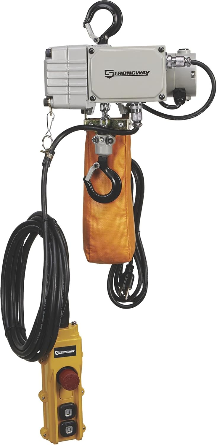 The Strongway Mini Electric Chain Hoist is designed for lifting and lowering loads up to 500 lbs. It features a durable construction and safety mechanisms for reliable operation.