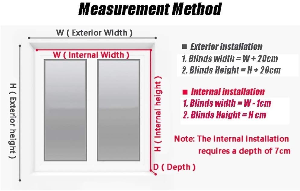 - Blinds width = Window width (W) + 20 cm (7.9 inches)