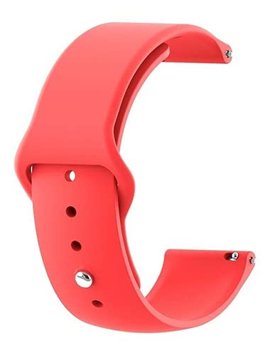 Image: A vibrant red silicone watch strap, showcasing its smooth texture and the quick-release pins at both ends, ready for attachment to a smartwatch.