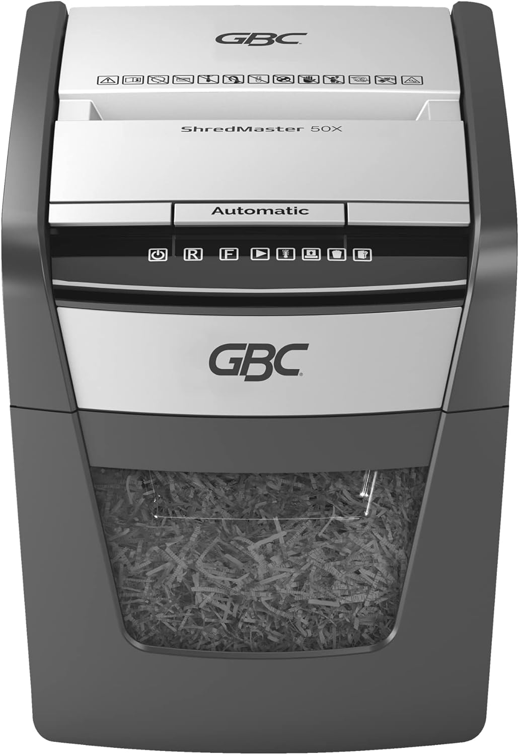The GBC ShredMaster AUTO+ 50X is designed for shredding paper documents and credit cards, offering a P-4 security level for confidential information. It features both automatic and manual feed options for convenience.