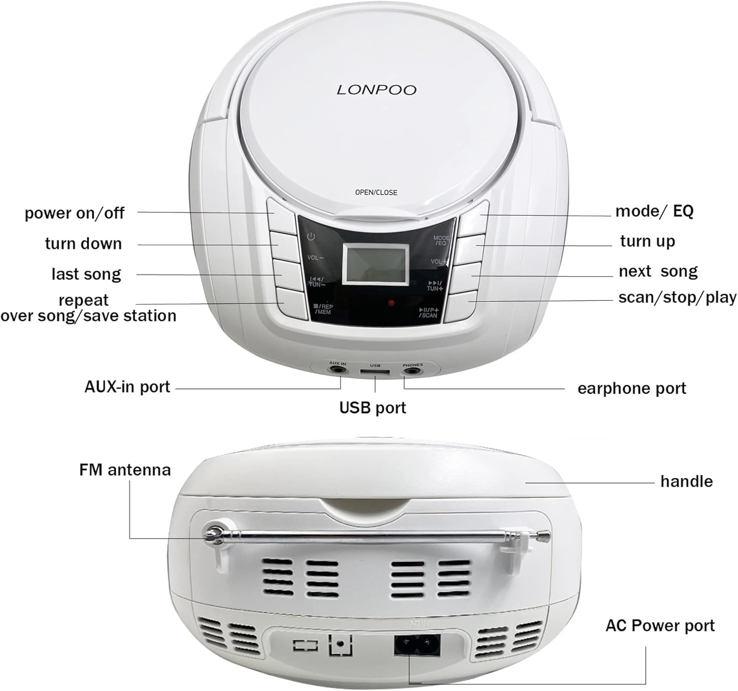 Image: Front and rear view of the LONPOO Portable CD Player Boombox, highlighting the power button, volume controls, mode/EQ button, track/tuning buttons, repeat/memory button, scan/stop/play button, AUX-in port, USB port, earphone port, FM antenna, handle, and AC power port.
